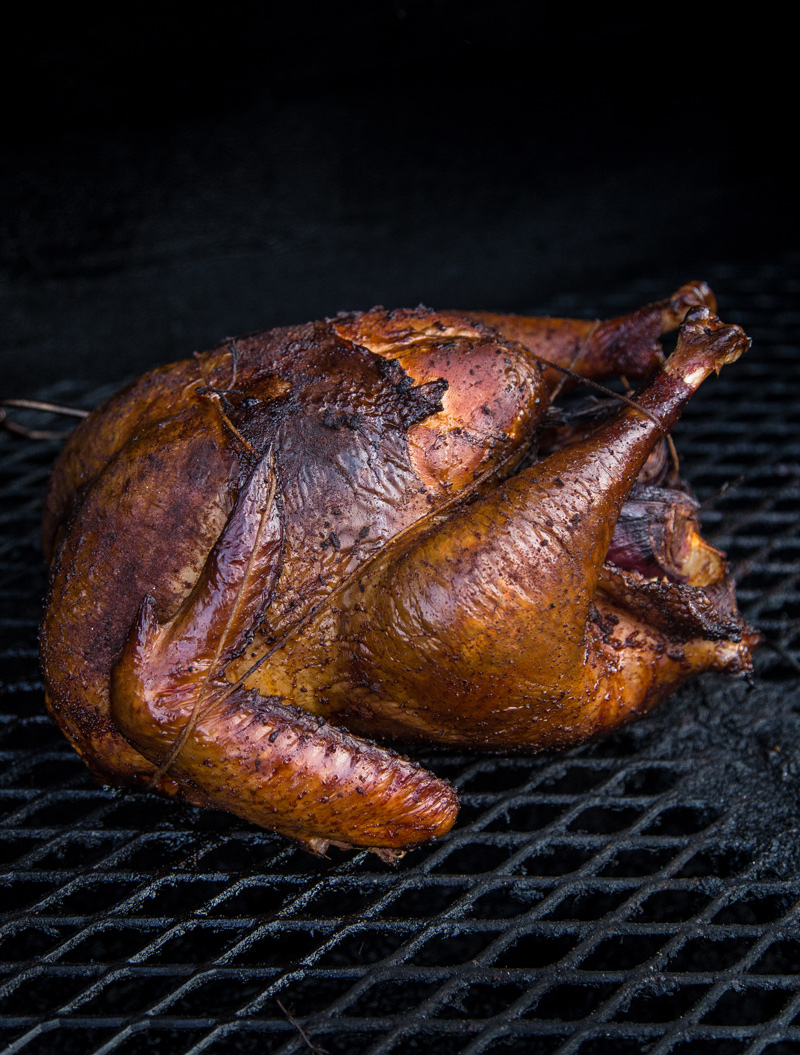 When smoking, even at 275, the challenge for any turkey will be crispy skin. If you want a crispy skin, a modification to the recipe is to wait until the bird gets to 145 degrees and then crank up the heat to 375. You run the risk of still drying out the bird, so we don’t push for a crispy skin when smoking. Another alternative is to make a glaze with your favorite BBQ sauce. You simply baste it close to when the turkey is done, and the glaze will thicken and add a flavor and texture. Something as simple as one part BBQ sauce to one part honey. The sugar will caramelize some.