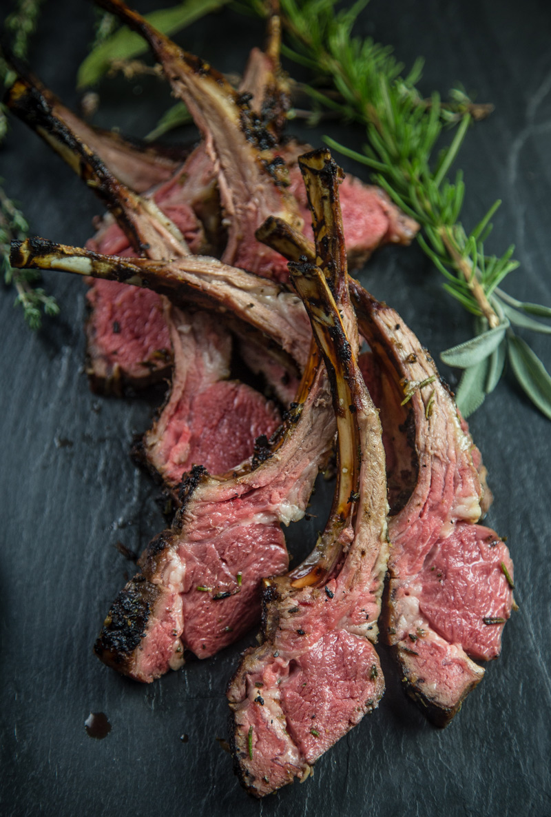 Sear the lamb 2 minutes per side for your crust. Look for an internal temperature of 125 for medium-rare, and 145 for medium-well. Let it rest for about 5 minutes, then slice into individual lollipops and serve.